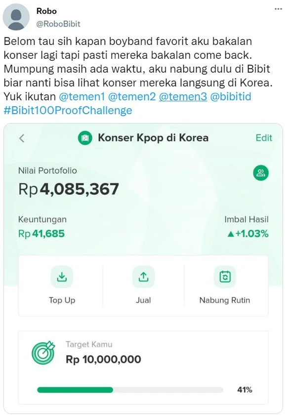 Buat portofolio tabungan di aplikasi Bibit menggunakan nama yang berhubungan dengan Kpop. Setelah itu, top up portofolio tersebut minimal 500 Ribu