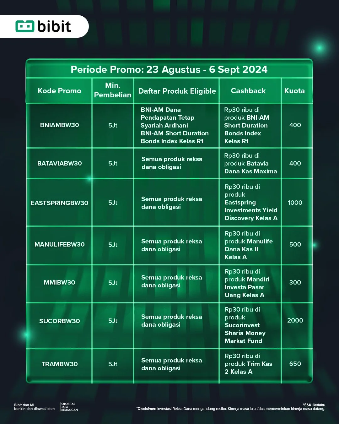 Bibit dapat mengubah atau memberhentikan promo dan syarat dan ketentuan promo sewaktu-waktu tanpa pemberitahuan sebelumnya.