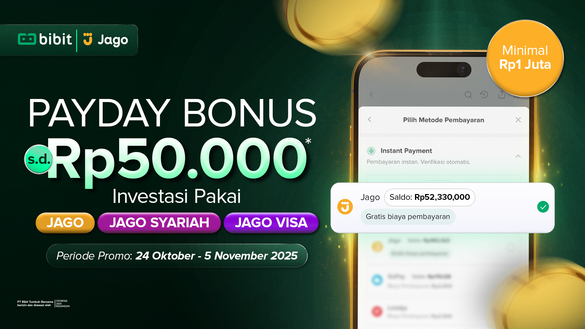 Payday promo untuk pengguna Bibit dan Jago. Dapatkan bonus berupa saldo Jago hingga Rp50 ribu dengan investasi reksa dana di Bibit dan transaksi menggunakan Jago Visa. Baca syarat dan ketentuan selengkapnya!