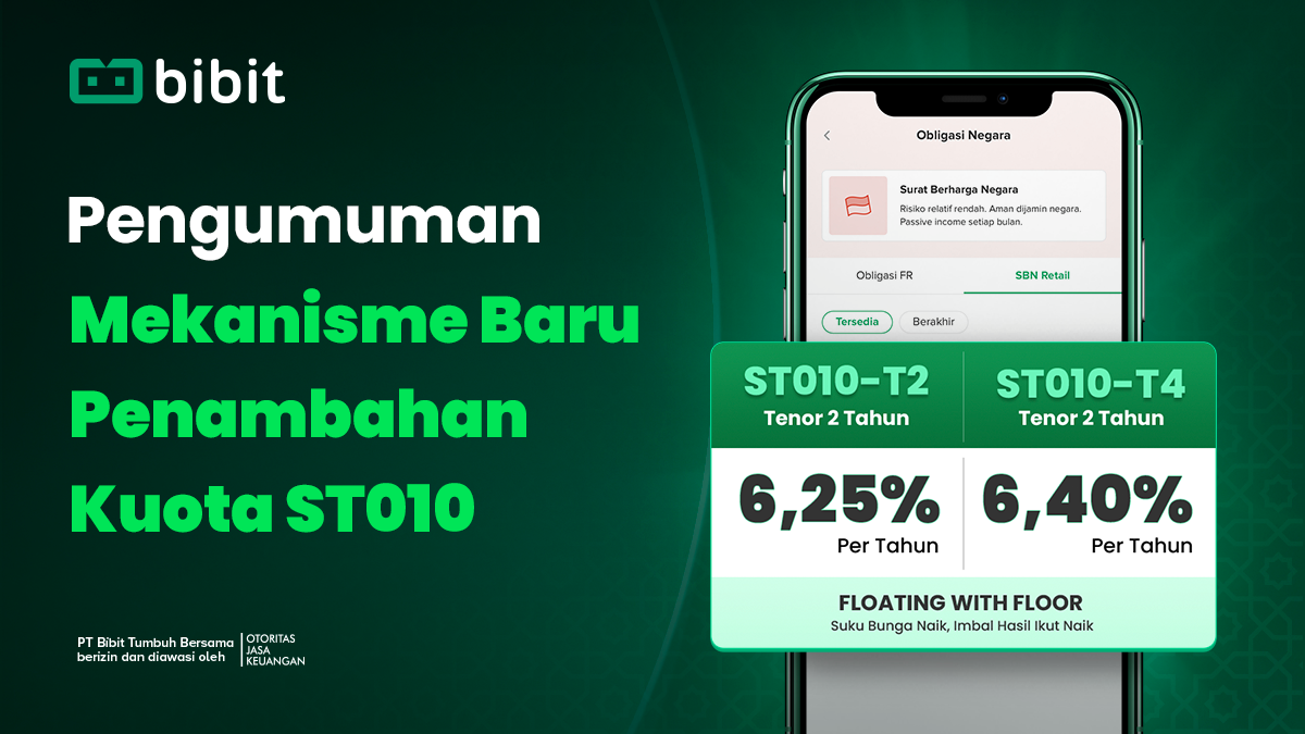 Jadi, imbal hasil ST010 ikut naik jika suku bunga acuan BI naik. Namun, kamu nggak perlu khawatir jika suku bunga BI turun karena imbal hasil ST010 nggak mungkin turun di bawah batas minimal yang telah ditentukan.