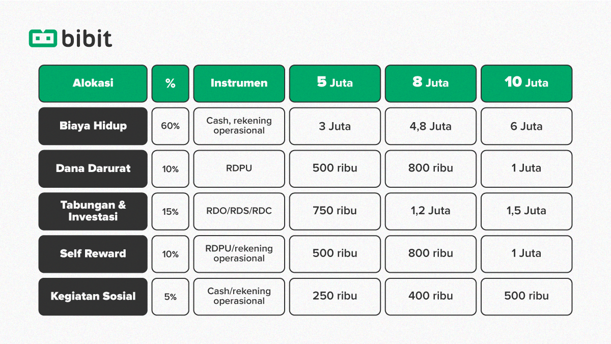 Tentu saja dengan melakukan alokasi gaji bulanan yang tentunya bisa kamu sesuaikan dengan budget yang kamu punya. Ingat! Jangan sampai besar pasak daripada tiang, ya! Bibit punya rekomendasi alokasi gaji yang bisa kamu terapkan setiap bulannya, Simak selengkapnya di bawah ini!