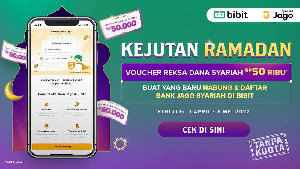 Promo khusus pengguna baru Jago Syariah yang menyelesaikan registrasi melalui aplikasi Bibit mulai 1 April 2022