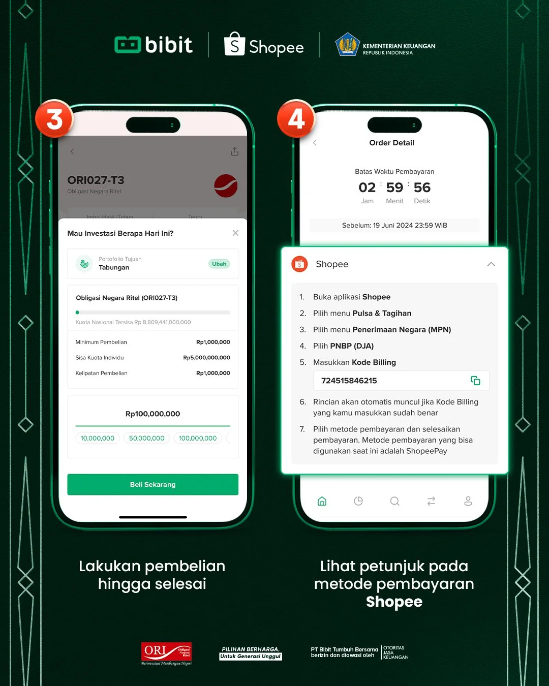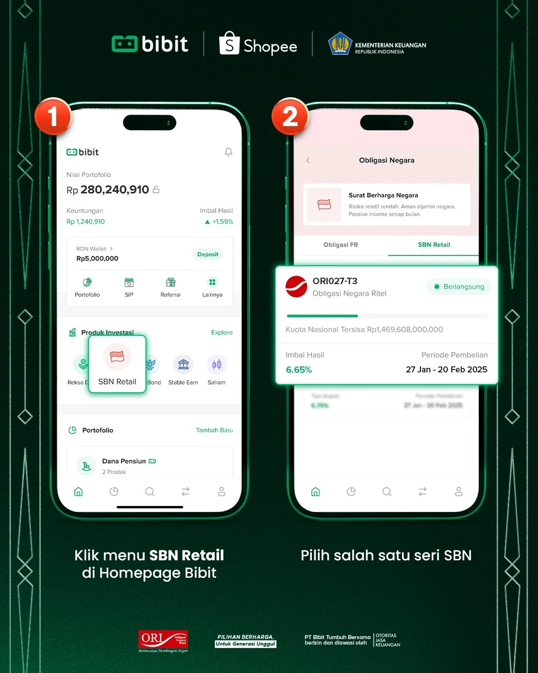 1. Promo berlaku untuk transaksi SBN ORI027 di Bibit senilai Rp1-50 juta yang menggunakan metode pembayaran Shopee selama 27 Januari - 20 Februari 2025.