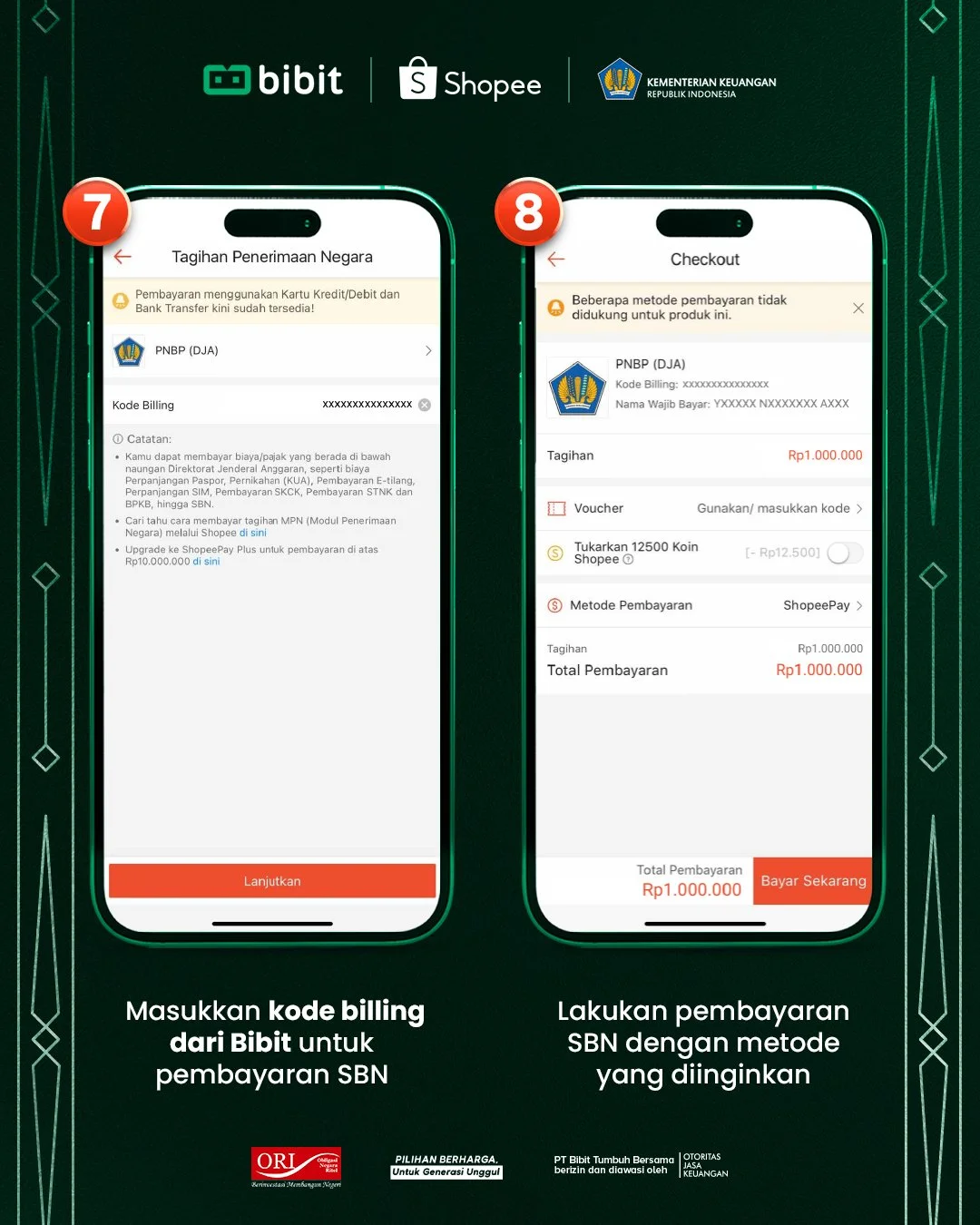 7. Masukkan Kode Billing dari Bibit untuk pembayaran SBN
