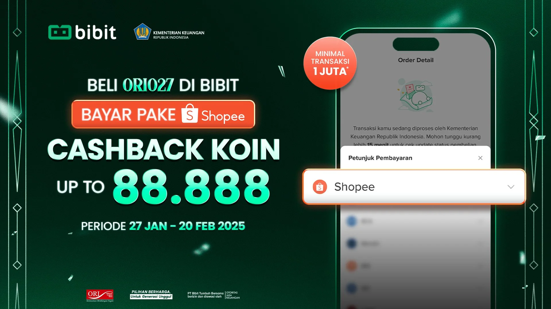 Biar lebih untung, beli ORI027 di Bibit pakai metode pembayaran Shopee. Raih kesempatan cashback hingga 88.888 koin Shopee atau setara Rp88.888 ribu!