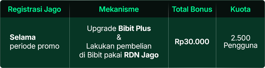 Pengguna berhak mendapatkan mendapatkan bonus Rp 30.000 berupa saldo Jago jika menyelesaikan registrasi Bank Jago / Jago Syariah melalui Bibit DAN melakukan pembelian produk reksa dana/saham/Obligasi FR di Bibit paling sedikit Rp 100.000 menggunakan metode pembayaran Bank Jago/Jago Syariah atau RDN Jago.