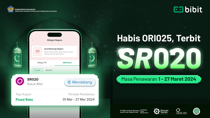 Penawaran ORI025 telah berakhir pada Kamis, 22 Februari 2024 pukul 10.00 WIB. Setelah ORI025, kini pemerintah akan kembali menerbitkan SBN Ritel kedua di tahun ini yaitu Sukuk Ritel seri SR020 yang nantinya bisa dibeli di Bibit.