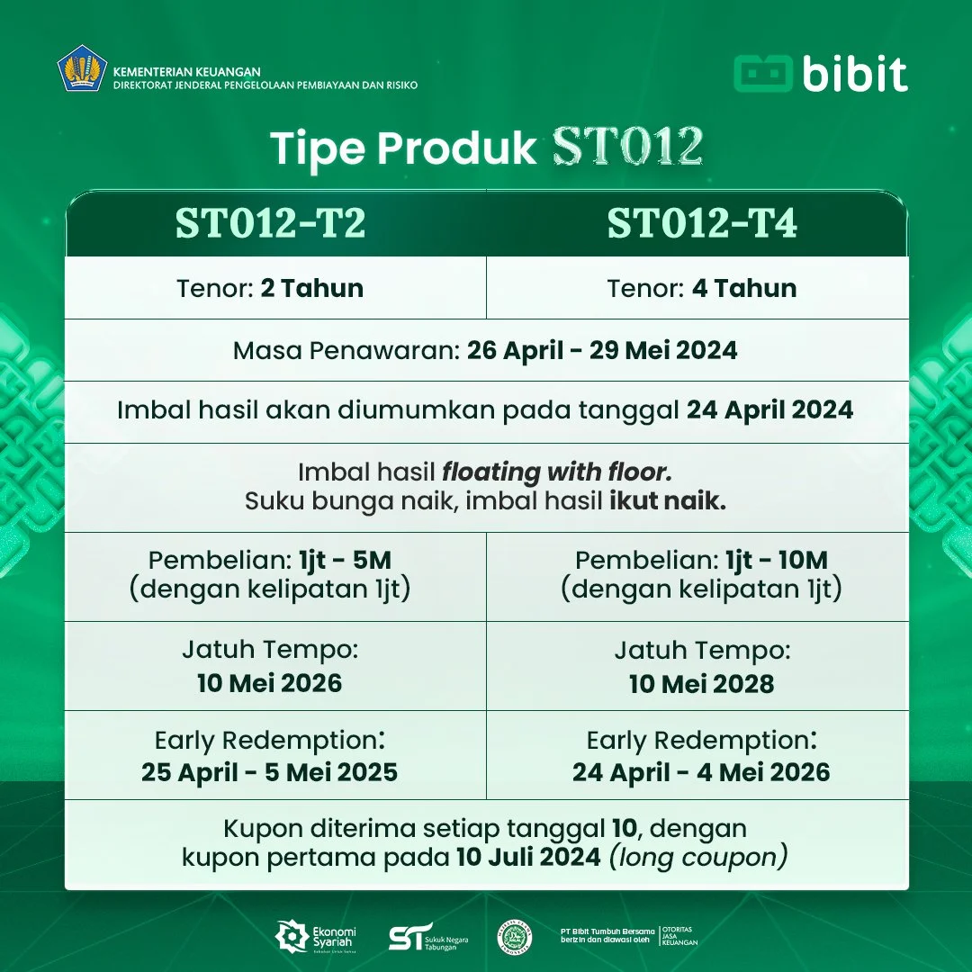 ST012 diluncurkan dengan dua tenor waktu yakni 2 tahun dan 4 tahun, bisa disesuaikan dengan jangka waktu investasi.
