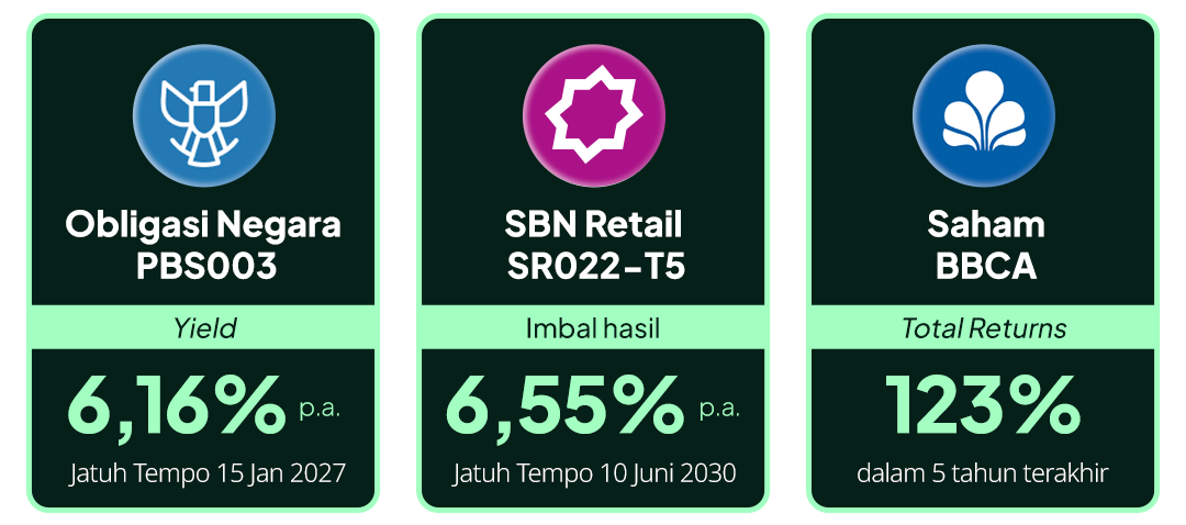 Obligasi Negara PBS003: Yield 6,16% p.a. Jatuh tempo 15 Januari 2027.