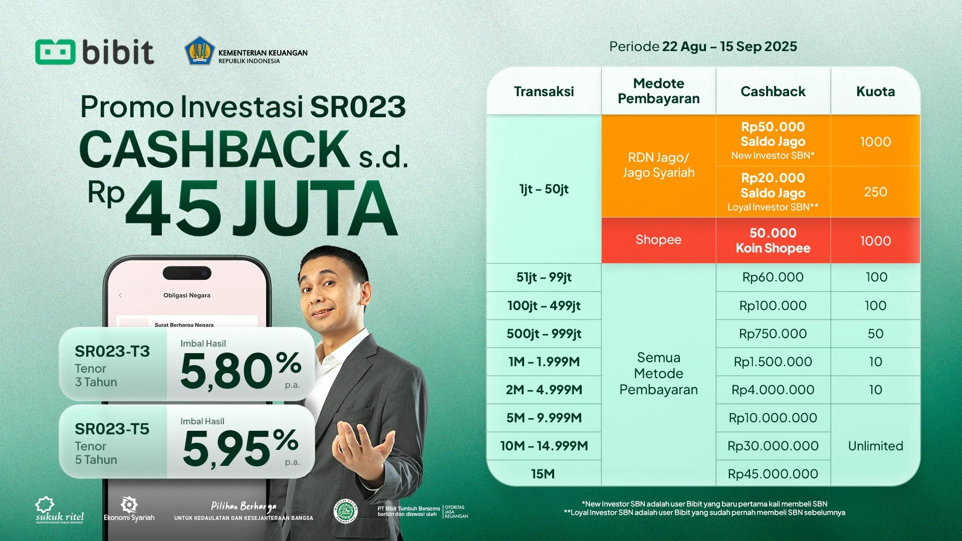 SBN Syariah Sukuk Ritel seri SR023 saat ini bisa dibeli di Bibit mulai dari 22 Agustus 2025 pukul 09.00 WIB hingga 15 September 2025 pukul 10.00 WIB.