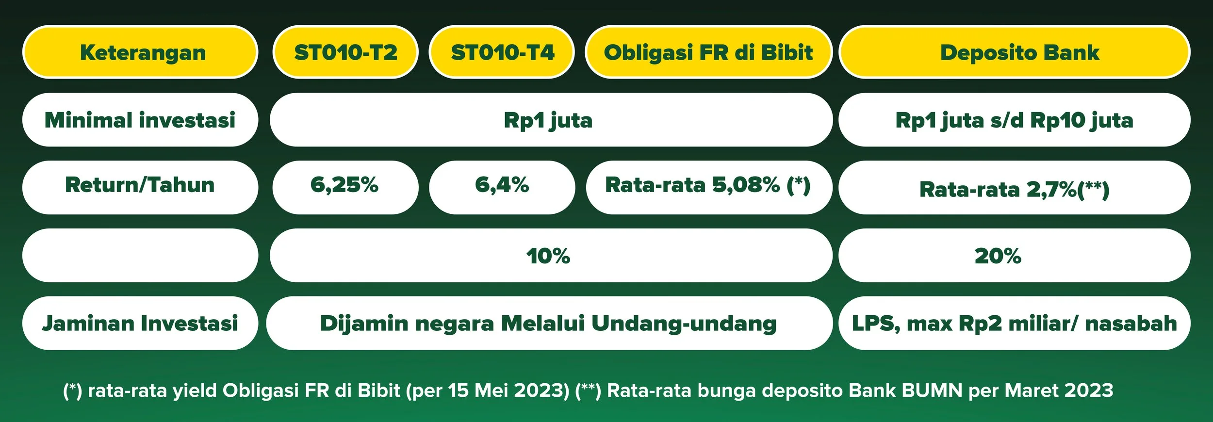 ST010-T2 menawarkan imbal hasil minimal 6,25% per tahun dan ST010-T4 memberikan imbal hasil minimal 6,4% per tahun.