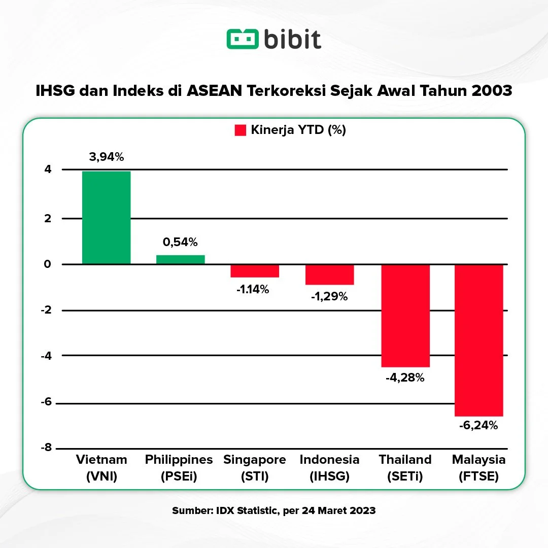 Indeks Harga Saham Gabungan (IHSG) terkoreksi 1,29% sejak awal tahun hingga 24 Maret 2023. Kondisi ini tak hanya terjadi di Indonesia, melainkan juga di kawasan regional.