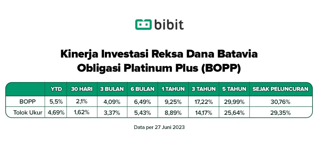 Dari kinerja historisnya, Reksa Dana Batavia Obligasi Platinum Plus mampu mencatatkan return positif sejak diluncurkan. Dalam jangka waktu 5 tahun, produk ini mencetak imbal hasil 29,99%, atau mengindikasikan CAGR 5,84%.