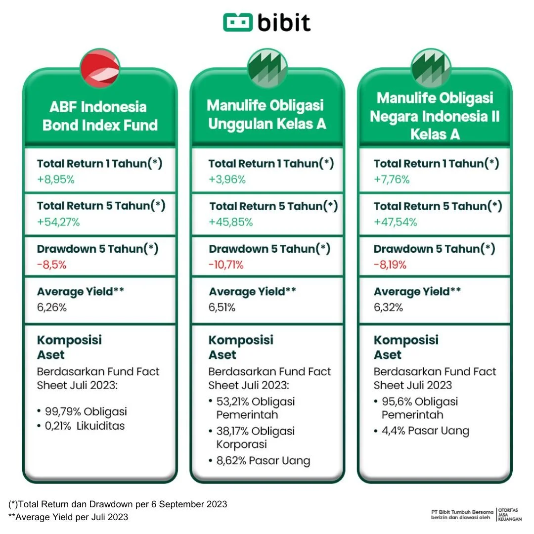Berikut ini performa beberapa produk Reksa Dana Obligasi di Bibit: