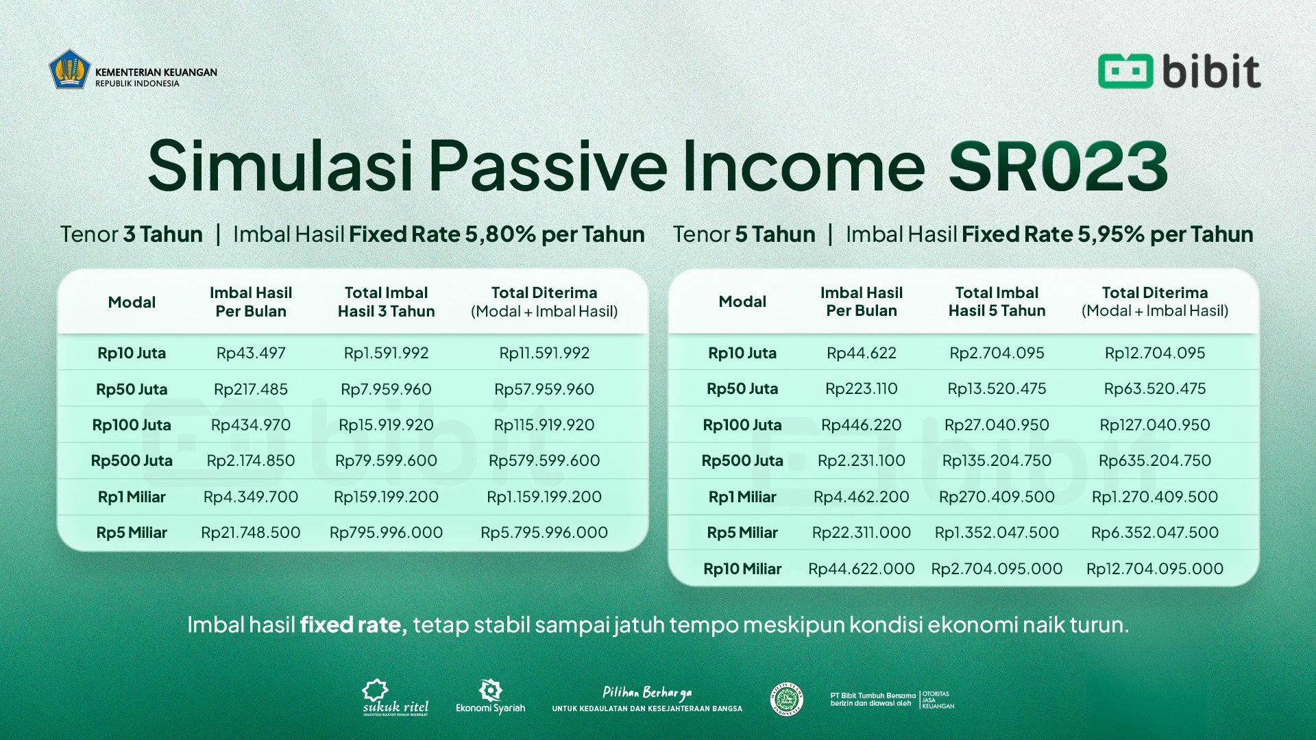 SR023 membayarkan kupon bulanan kepada investor, ditransfer setiap tanggal 10. Berikut simulasi passive income untuk SR023 tenor 3 dan 5 tahun.