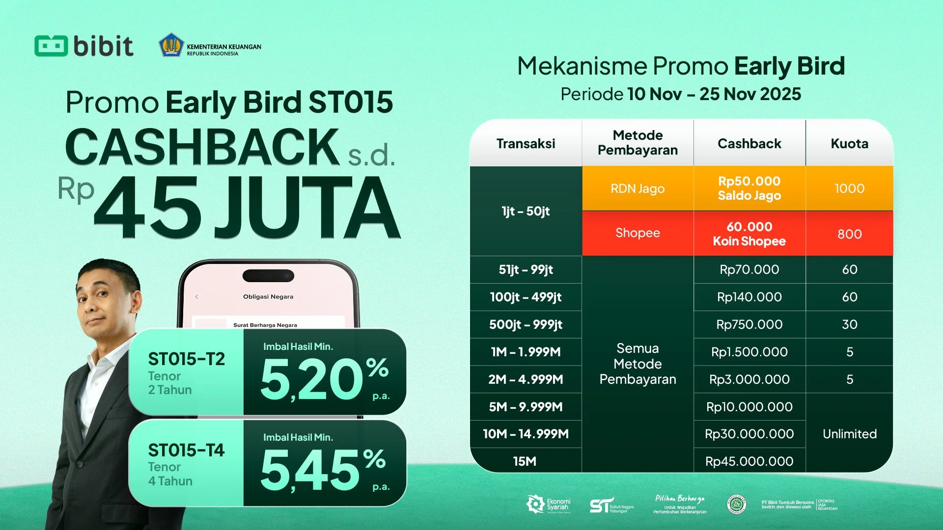 Kamu bisa dapatkan promo lebih besar pada periode promo Early Bird di Bibit (10 - 25 November 2025)! Berikut promo yang bisa kamu dapatkan dari pembelian SBN ST015 di Bibit: