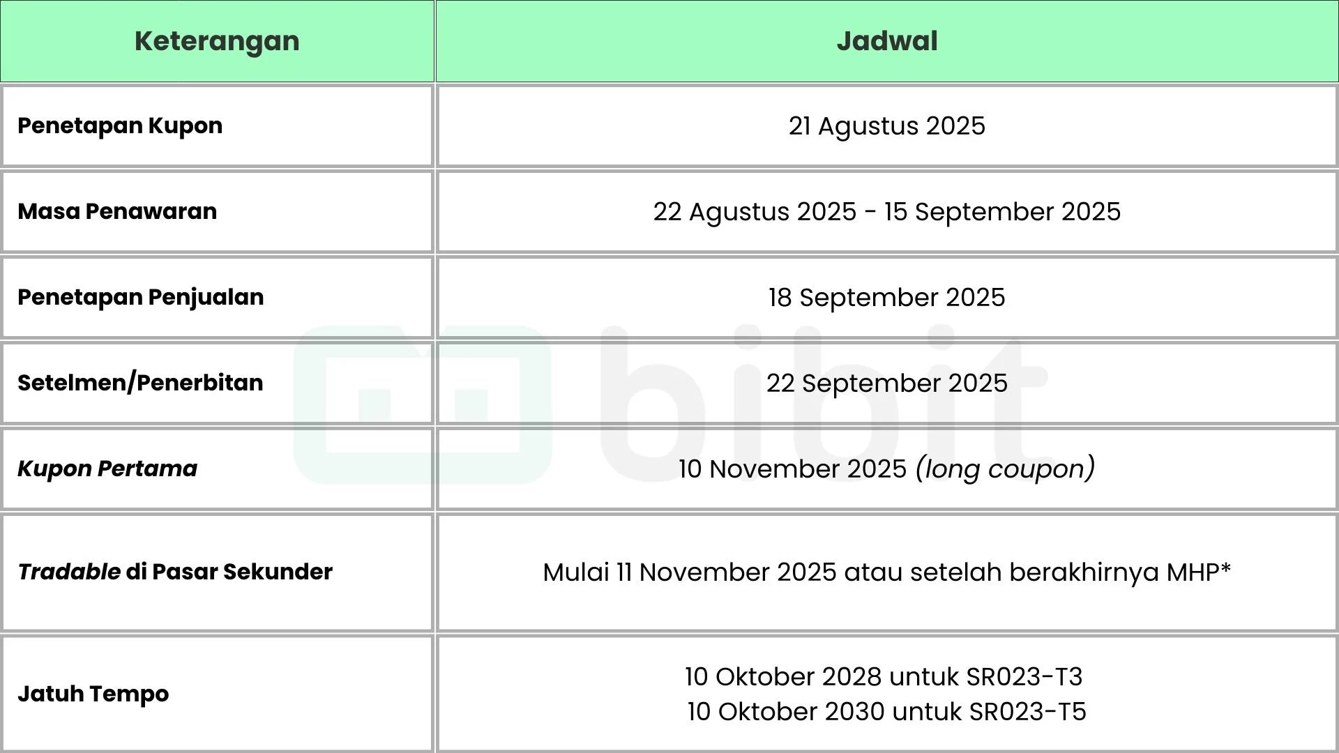 Jatuh Tempo: 10 Oktober 2028 untuk SR023-T3 & 10 Oktober 2030 untuk SR023-T5